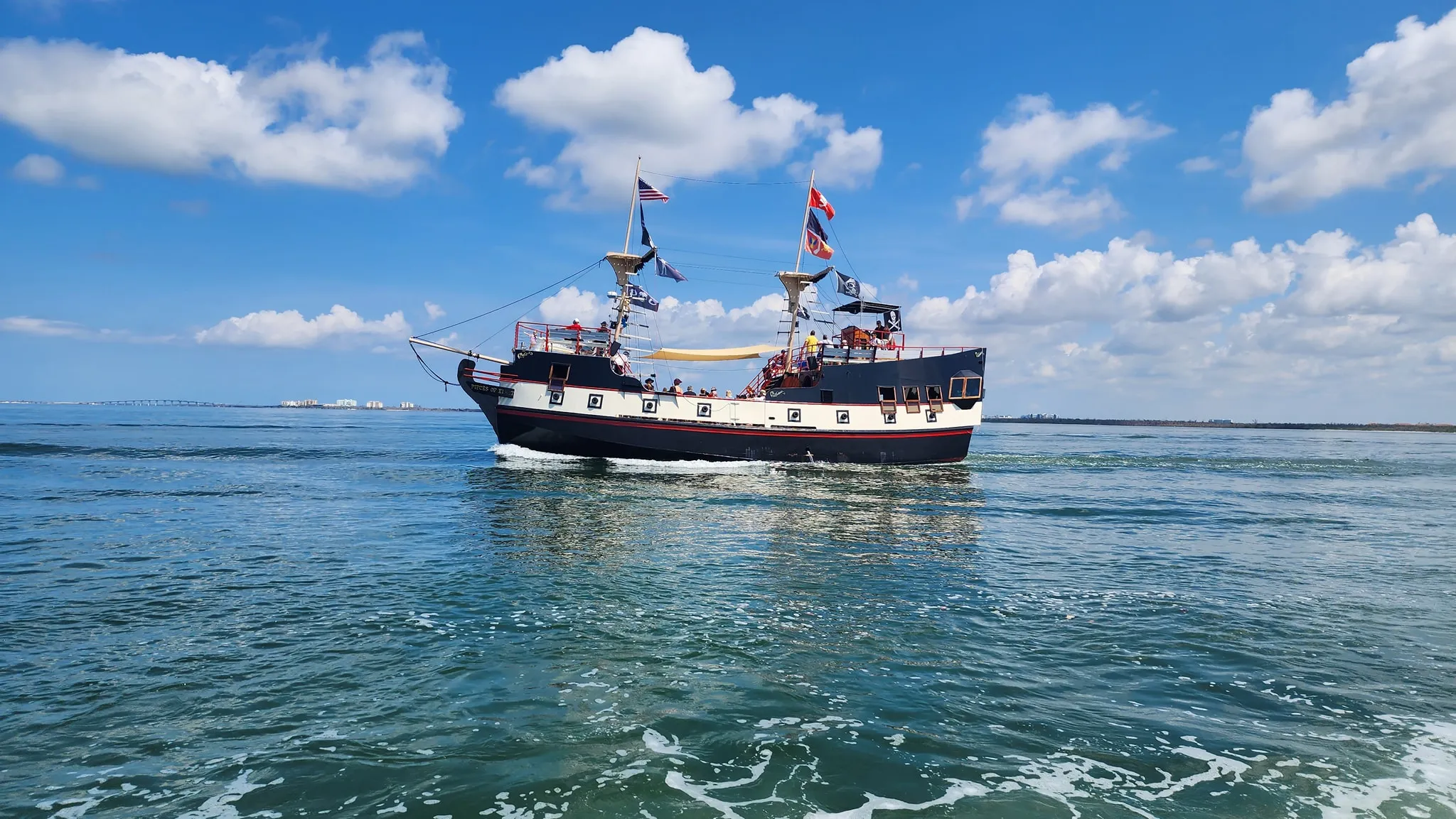 Our most popular voyage, the All-Ages Pirate Cruise is a 90-minute interactive comedy adventure that’s perfect for adults, teens, and little buccaneers alike! Step aboard the Pieces of Eight, our 65-foot replica Spanish galleon, for a high-seas escapade packed with jokes, games, and adventure for all ages.